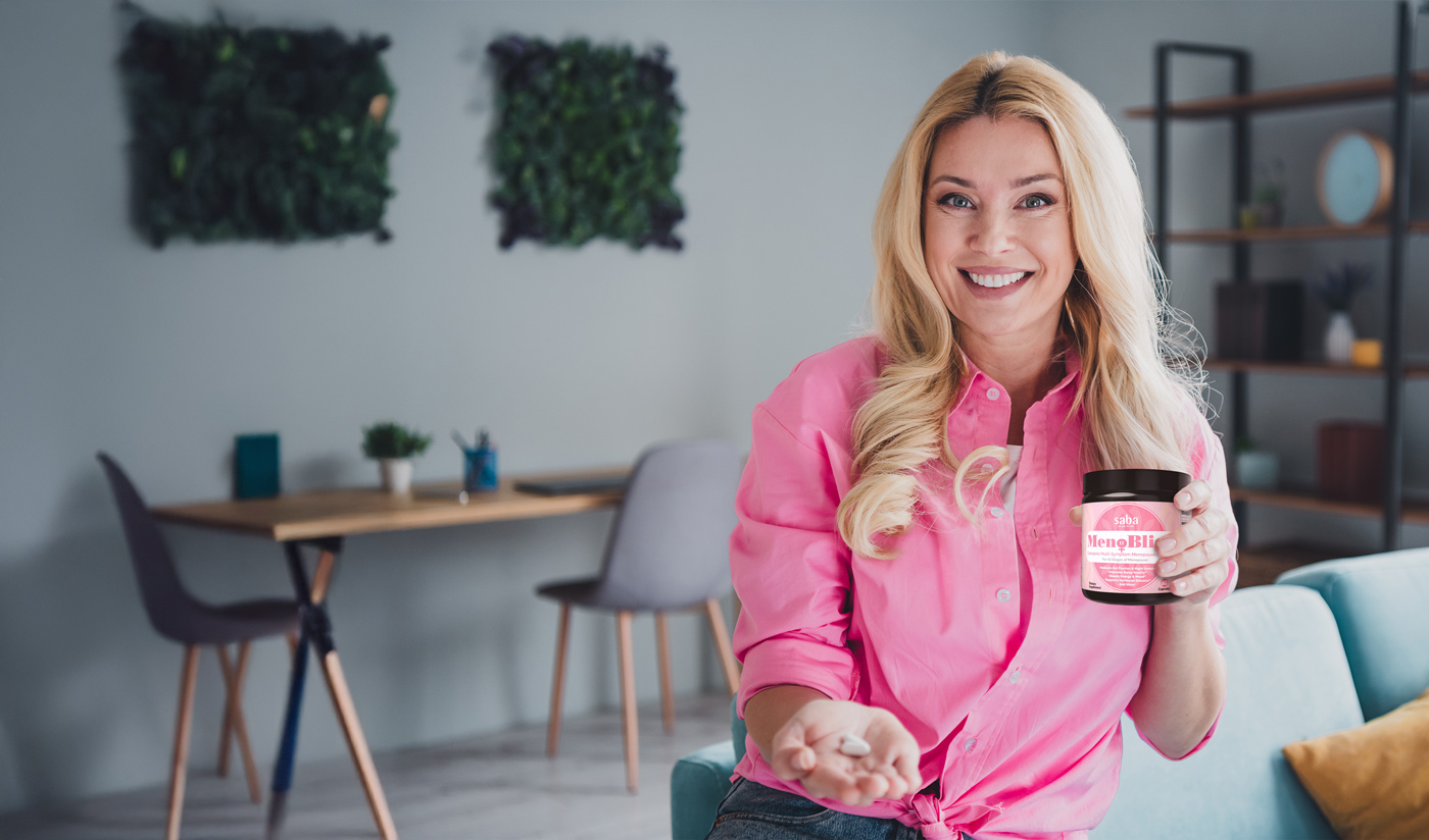 Saba MenoBliss™ is an advanced menopause supplement designed to provide comprehensive relief from menopause symptoms. It com-bines five clinically supported ingredients, including EstroG-100™, to address issues like hot flashes, mood swings, and vaginal dryness.
